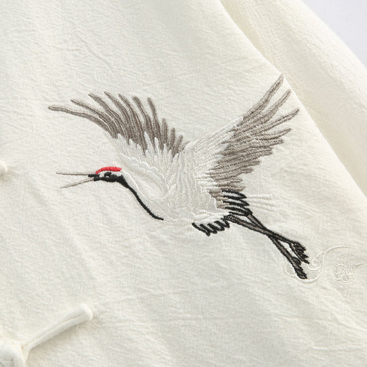 Buddha Stones中国の旧正月 鶴刺繍 唐装 漢服 長袖 トップス パンツ 衣類 コットンリネン メンズセット ポケット付き