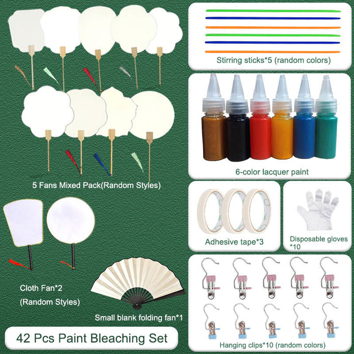 42個のペイント漂白セット:ファン5個ミックスパック(ランダムスタイル)、布製ファン*2(ランダムスタイル)、小さな空白の折りたたみ式ファン*1、かき混ぜ棒*5(ランダムカラー)、6色ラッカーペイント、粘着テープ*3、使い捨て手袋*10、吊り下げクリップ*10(ランダムカラー)。