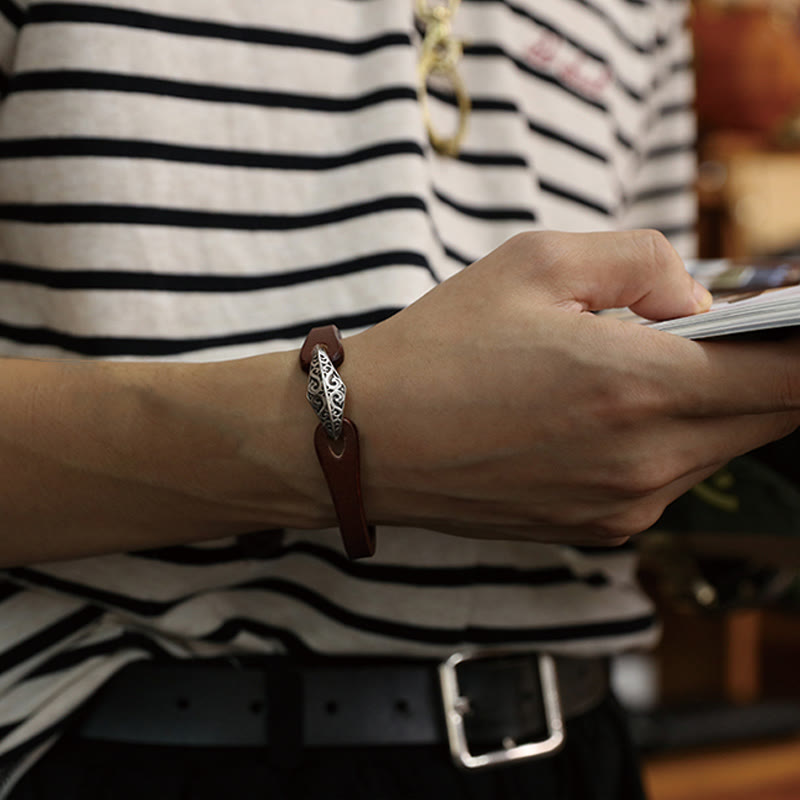 強さの象徴:レザーブレスレットは、強さと回復力の象徴としてよく知られています。素材自体が耐久性に優れており、着用者が困難や苦難に耐える能力を象徴しています。