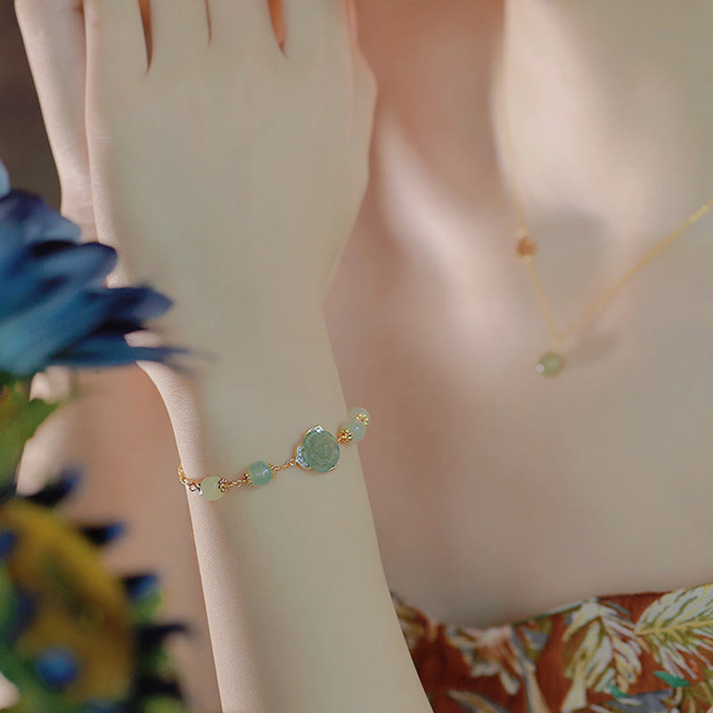 Buddha Stones14K ゴールドメッキ 和田翡翠 ローズフラワー 幸運のチェーンブレスレット