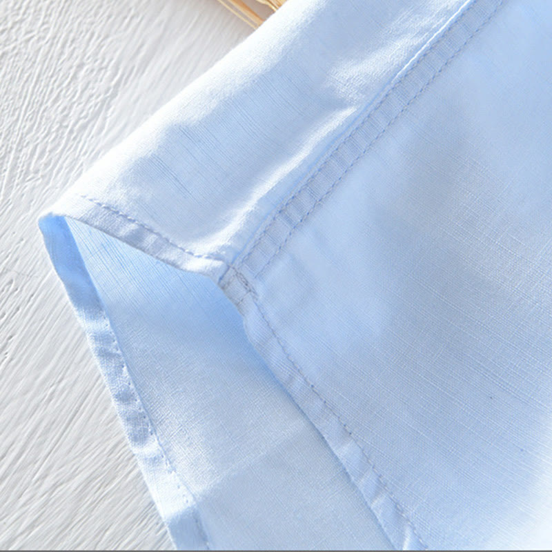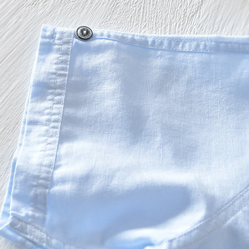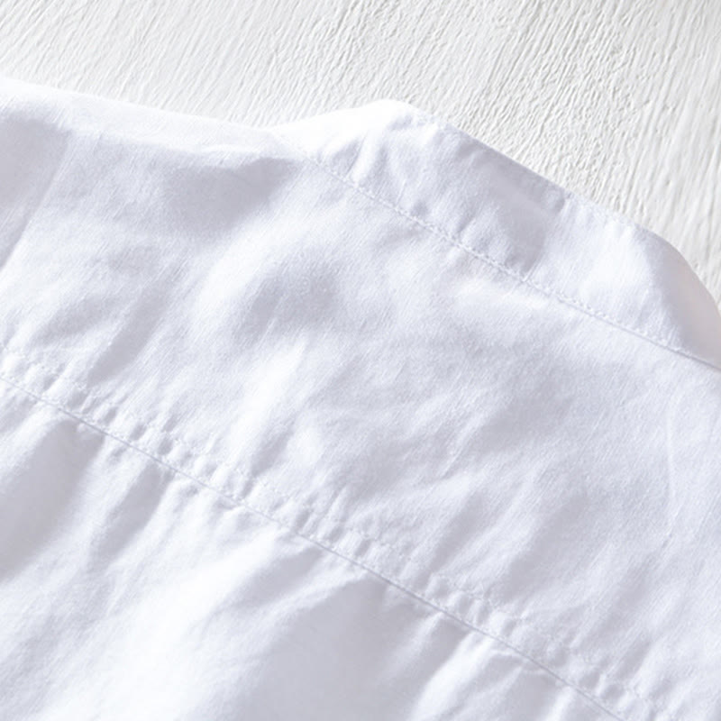 Buddha Stones無地ハーフボタンデザインスタンドカラーメンズ半袖コットンリネンシャツ