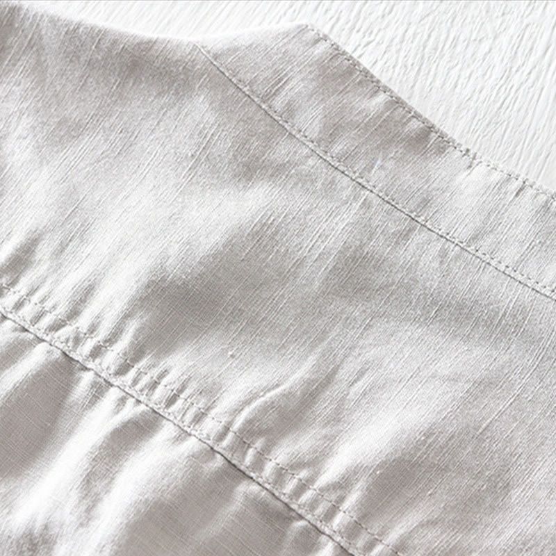 Buddha Stones無地ハーフボタンデザインスタンドカラーメンズ半袖コットンリネンシャツ - image 11