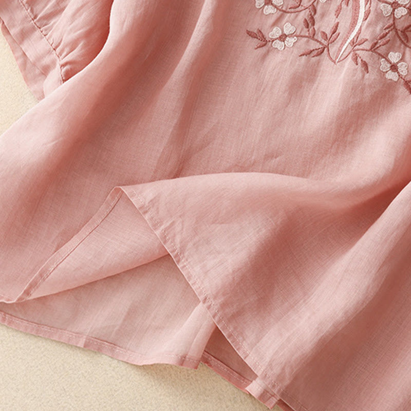 Buddha Stones夏 カジュアル 刺繍 花 レディース Vネック デザイン 半袖 アクリル Tシャツ - ピンク - US8-10,UK/AU12-14,EU40-42 (2XL) - image 6