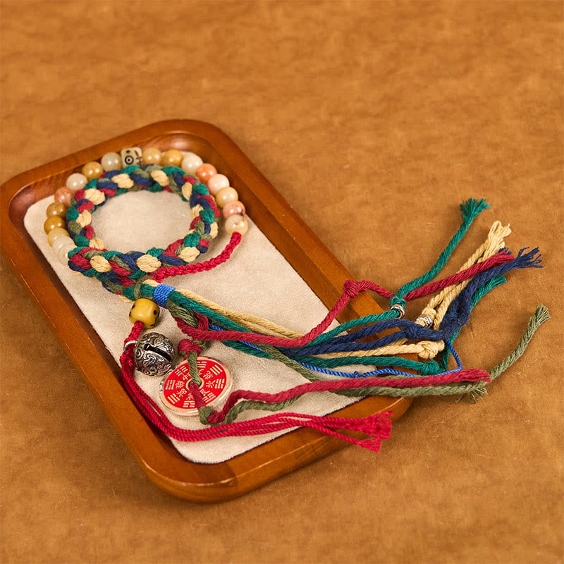 チベット密教の伝統では、儀式の際に手首に紐や紐を巻くことが一般的です。伝統的に、ラマ僧は紐を祝福し、結び目を作り、マントラを込めます。他の伝統と同様に、これらの赤い紐は幸運をもたらし、守護をもたらすと言われています。古代中国の伝説では、運命の赤い糸は目に見えないもので、人生が絡み合うすべての人々を結びつけます。これは中国の縁結びの神である月老によって支配されており、結婚する運命にある二人の絆と深く結びついています。歴史を通して、そして様々な哲学において、赤い紐は守護、信仰、幸運、強さ、そして繋がりのために身に着けられてきました。