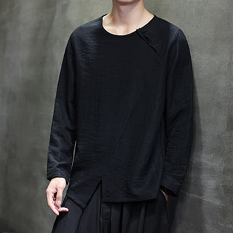 Buddha Stones無地 ゆったり 長袖 ラウンドネック コットン メンズシャツ
