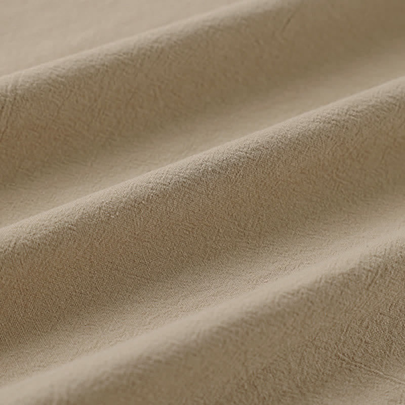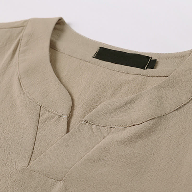 Buddha Stones 夏用刺繍入り半袖ノッチドカラーメンズコットンリネンTシャツ