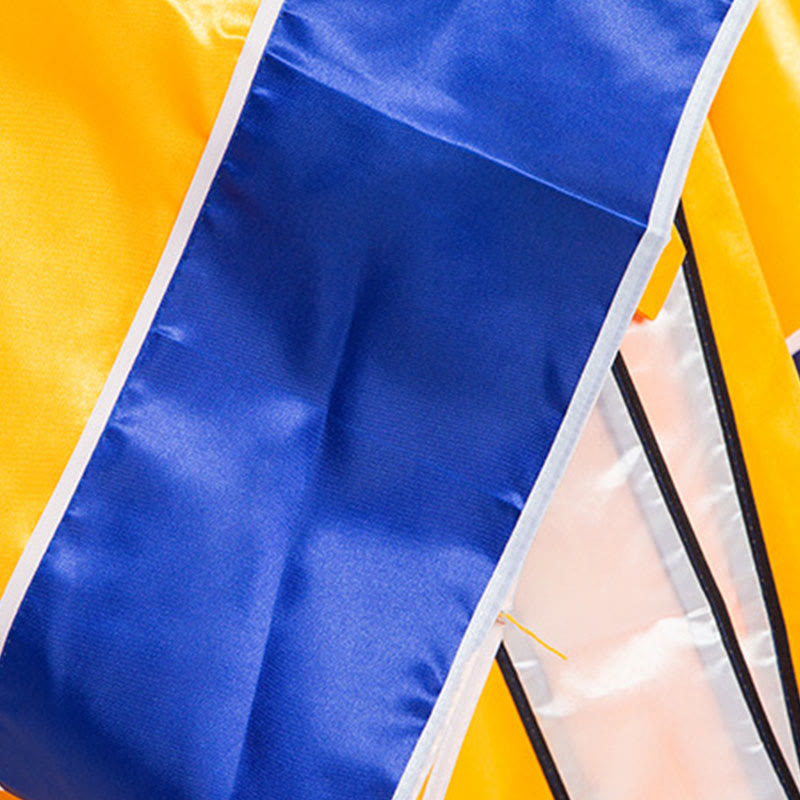 - 鮮やかな色彩と象徴的な刺繍: 明るい生地に青い縁取りと刺繍された縁起の良い模様が組み合わされ、保護、祝福、精神的な調和を象徴しています。
