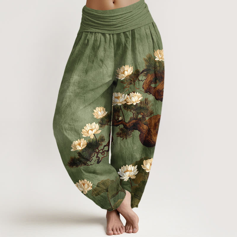 Buddha Stones ピュアコットンのエレガントな松と蓮の花の葉柄レディース伸縮性ウエストハーレムパンツ - image 1