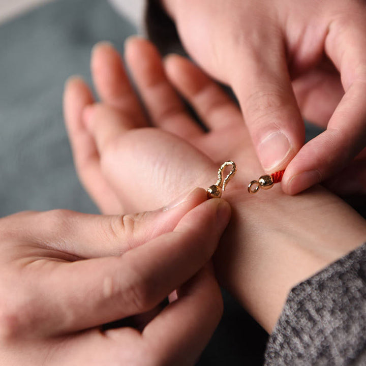 チベット密教の伝統では、儀式の際に手首に紐や紐を巻くことが一般的です。伝統的に、ラマ僧は紐を祝福し、結び目を作り、マントラを込めます。他の伝統と同様に、これらの赤い紐は幸運をもたらし、守護をもたらすと言われています。古代中国の伝説では、運命の赤い糸は目に見えないもので、人生が絡み合うすべての人々を結びつけます。これは中国の縁結びの神である月老によって支配されており、結婚する運命にある二人の絆と深く結びついています。歴史を通して、そして様々な哲学において、赤い紐は守護、信仰、幸運、強さ、そして繋がりのために身に着けられてきました。