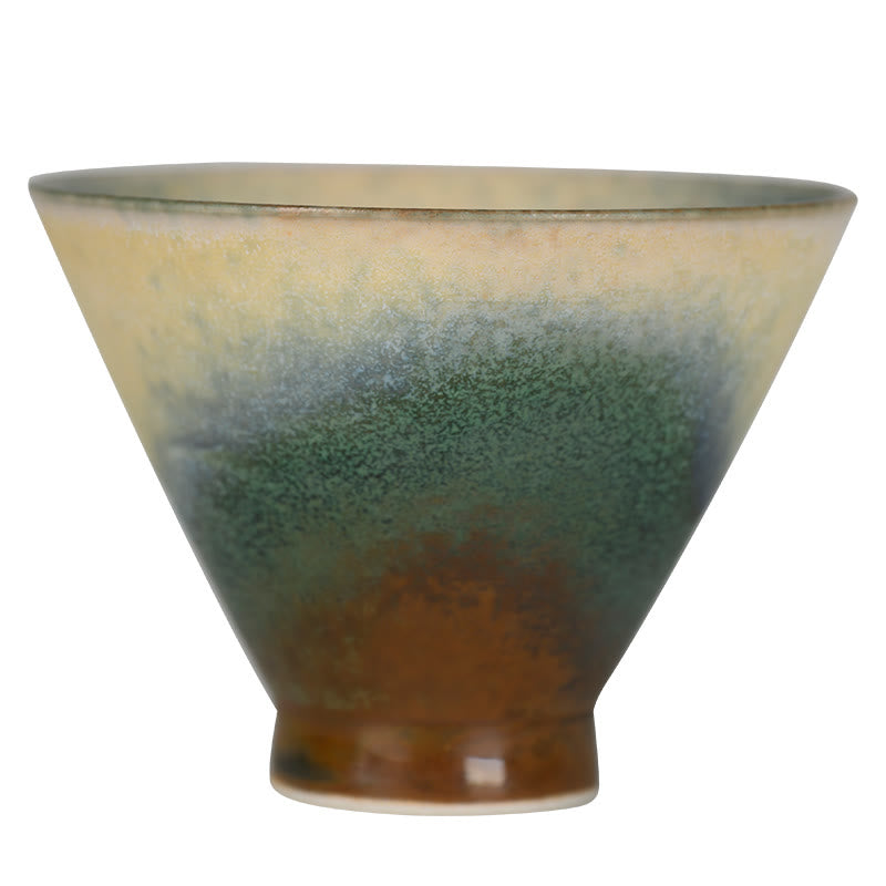 中国語で「窑変(やおびゃ)」とは、窯の中で色が変化することを指します。茶器に見られる釉薬の縞模様や斑紋は、焼成制御とは関係ありません。特定の釉薬のデザインと、窯で焼成された際にそれらが反応することによって自然に生じるものです。
