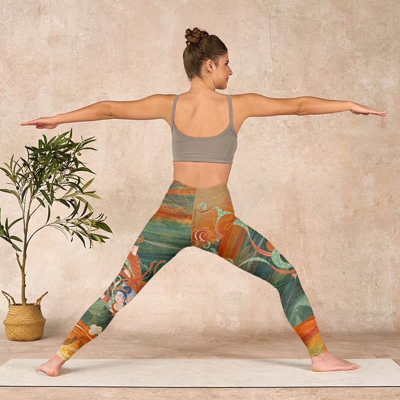 - デザインインスピレーション:このレギンスには、仏教美術における天人の優美さ、美しさ、そして霊妙な性質を象徴する、敦煌飛天女のデザインが施されています。躍動感あふれるポーズで描かれることが多いこれらの飛天女は、芸術的なインスピレーションと精神的な超越性を象徴し、敦煌の豊かな文化遺産と、芸術と精神性の調和を称えています。