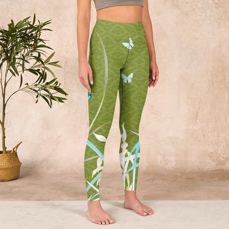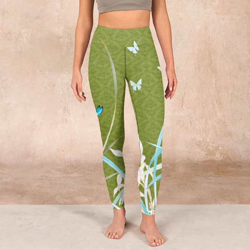 Buddha Stones、グリーン、蝶、蘭の花柄プリント、ジムレギンス、レディースヨガパンツ - image 1