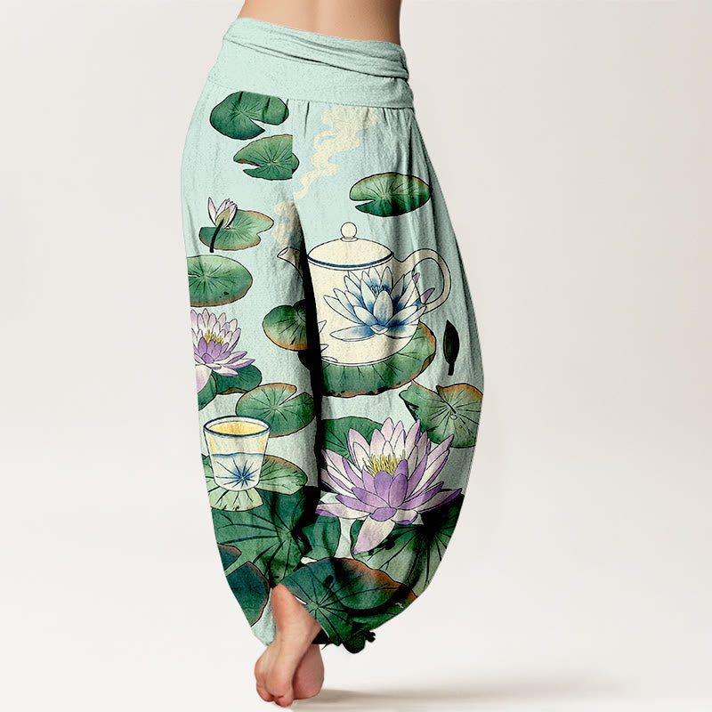 - デザイン:このハーレムパンツのデザインは、ティーポット、ティーカップ、蓮の花、蓮の葉からインスピレーションを得ています。蓮の花は清純さを象徴し、これらの要素が均等に配置され、安定した視覚的構造を形成しています。
