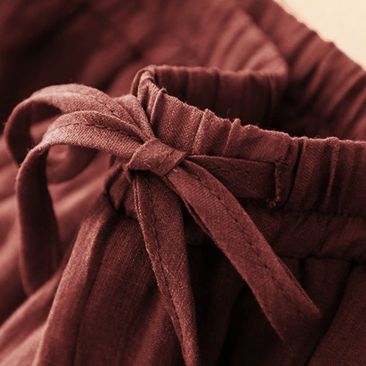 - シンプルなデザイン: このパンツは伸縮性のあるウエストバンドとドローストリングのデザイン要素を備えています。