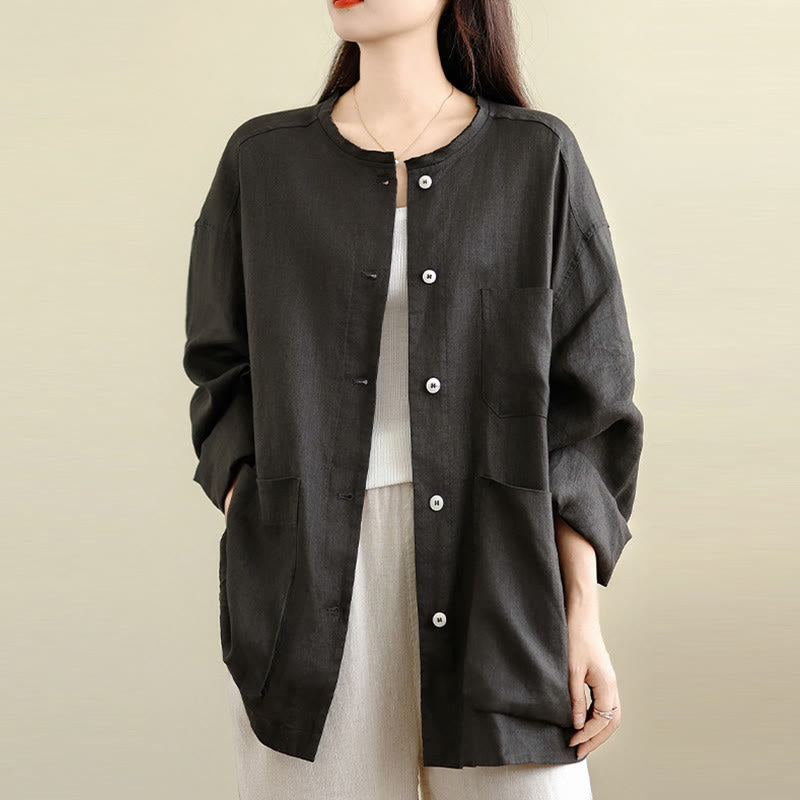 Buddha Stones 春のクルーネック長袖無地レディースコットンボタンシャツポケット付き - image 1