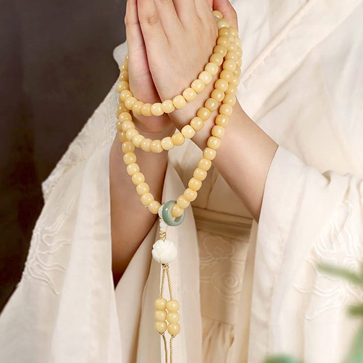 サンスクリット語で「菩提」は「悟りを開いた」または「目覚めた」という意味で、菩提種子は「悟りを開いた種子」を意味します。多くの修行者は、悟りを開いた種子として、瞑想修行中に菩提種子を身に着け、最終的に悟りを得ようとします。菩提は仏教において、仏陀が物事の本質を理解していることを表す言葉でもあります。これらの黒い斑点のあるシードビーズは、神の知恵を求めるすべての人々にとって特別な意味を持っています。