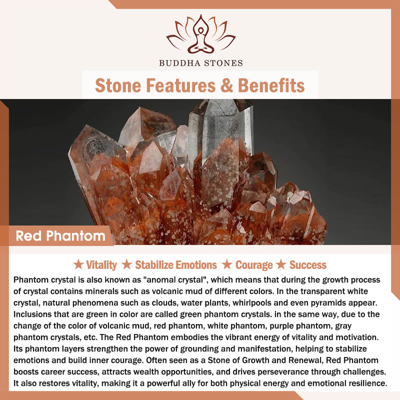 ファントムクリスタルは「アノマルクリスタル」とも呼ばれ、水晶の成長過程で様々な色の火山泥などの鉱物が混入することを意味します。透明な白い水晶の中には、雲、水草、渦巻き、さらにはピラミッドといった自然現象が見られます。緑色のインクルージョンはグリーンファントムクリスタルと呼ばれます。同様に、火山泥の色の変化によって、レッドファントム、ホワイトファントム、パープルファントム、グレーファントムクリスタルなど、様々な色のファントムが存在します。レッドファントムは、活力とモチベーションのエネルギーを体現しています。ファントム層は、グラウンディングと顕現の力を強化し、感情を安定させ、内なる勇気を育むのに役立ちます。成長と再生の石としてよく見られるレッドファントムは、キャリアの成就を後押しし、富のチャンスを引き寄せ、困難を乗り越える忍耐力を育みます。また、活力を回復させる力があり、肉体的なエネルギーと精神的な回復力の両方において強力な味方となります。