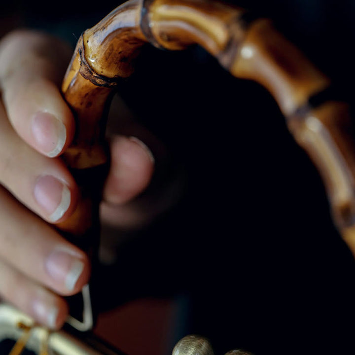 - 素材: ポリエステル、綿、金属、竹製ハンドル、タッセルアクセサリー; 裏地: 綿