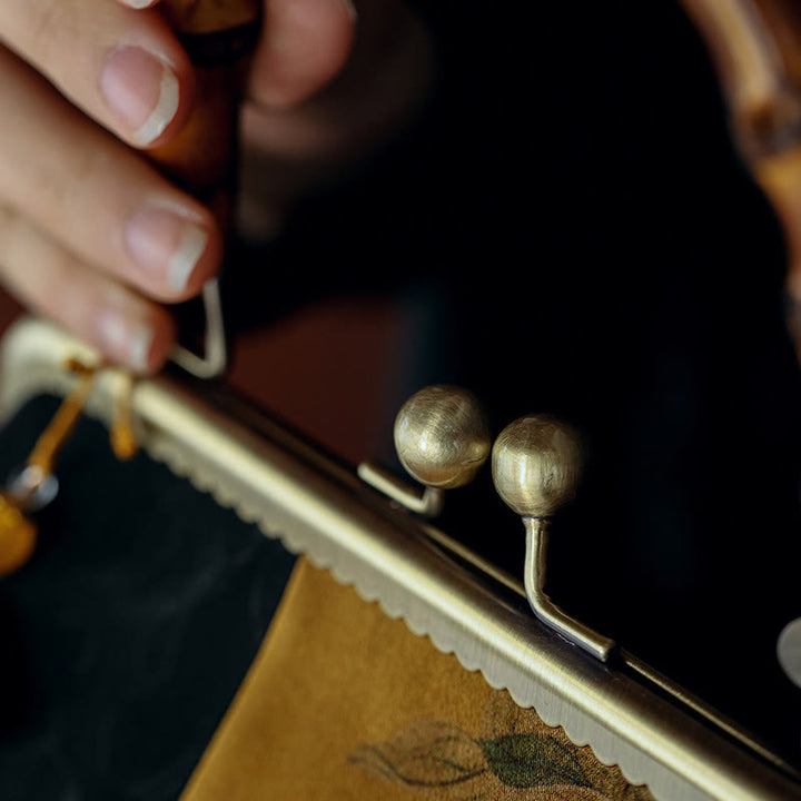 葉、鳥、枝、柿の花をあしらったエレガントなデザインに、竹製のハンドルがアクセントを添えた「葉、鳥、枝、柿の花」ハンドバッグ。自然からインスピレーションを得た美しさと実用的なデザインが融合したスタイリッシュなハンドバッグは、普段使いにも特別な日にもぴったりです。精巧なアートワークと個性的な要素が、装いに魅力と洗練された雰囲気を添えます。💕