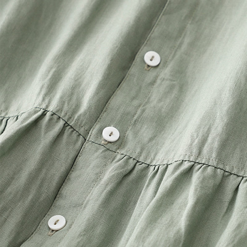 Buddha Stonesカジュアル プレーンボタン クルーネック フリルネック 半袖 コットンリネン レディース ミディドレス - image 1