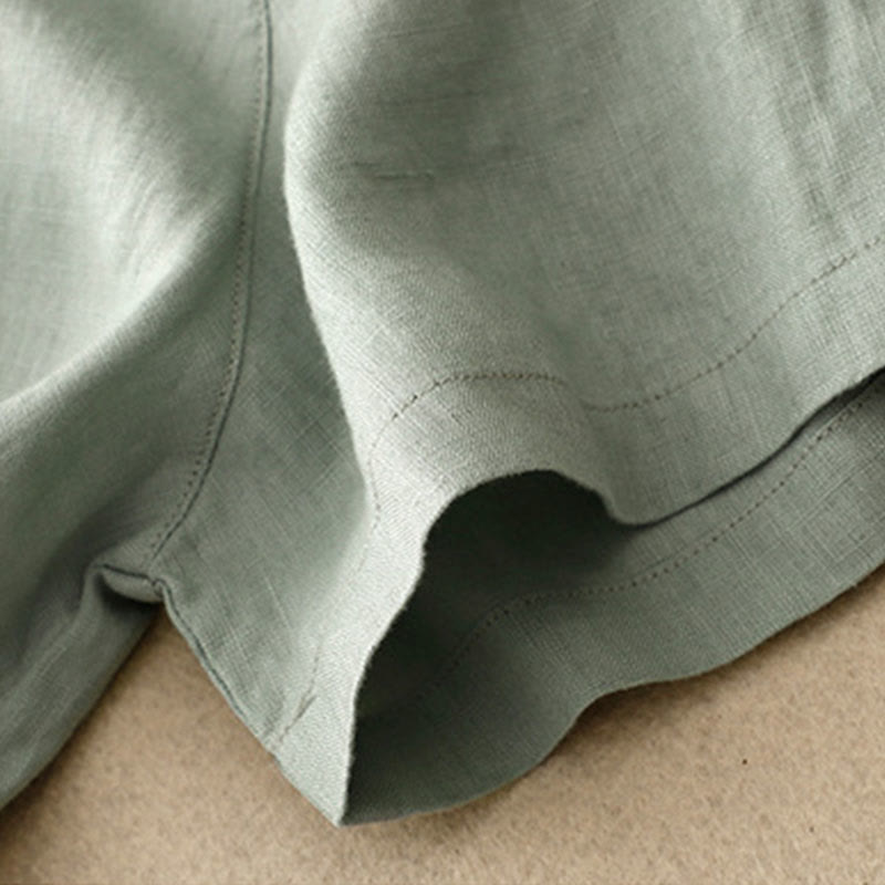 Buddha Stonesカジュアル プレーンボタン クルーネック フリルネック 半袖 コットンリネン レディース ミディドレス