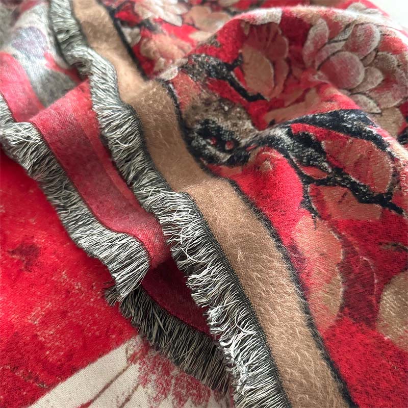 Buddha Stones、秋鶴、蓮、梅の花柄、タッセル、心地よいソフトスカーフショール - 赤 - 180×65cm - image 0