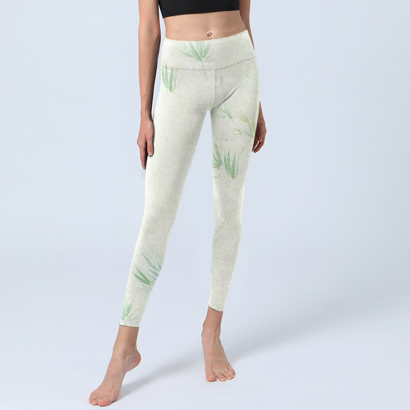 Buddha Stonesと緑の竹の葉のプリントスポーツレギンスレディースヨガパンツ - 象牙 - US18、 UK/AU22、 EU50 (4XL) - image 0