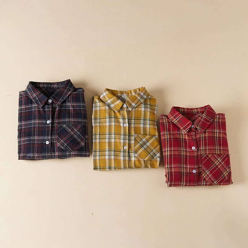 Buddha Stones春カラーコントラストチェック柄ラペルロングスリーブコットンミディドレス(ポケット付き)