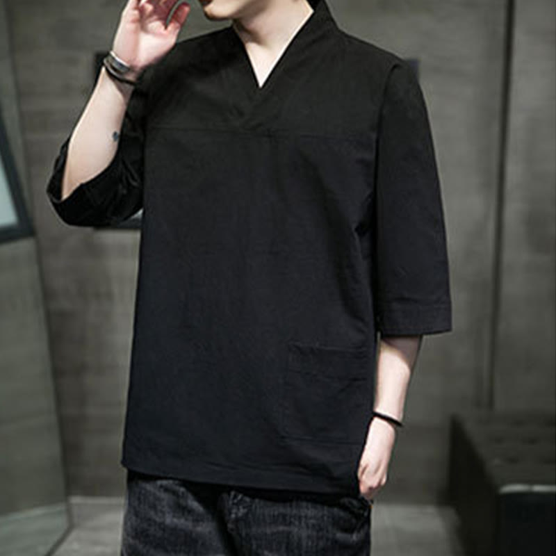 Buddha Stones夏 カジュアル シンプル Vネック デザイン メンズ コットン リネン 七分袖 Tシャツ フロントポケット付き