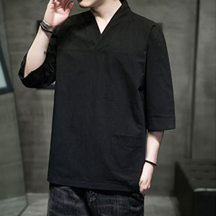 Buddha Stones夏 カジュアル シンプル Vネック デザイン メンズ コットン リネン 七分袖 Tシャツ フロントポケット付き - image 1
