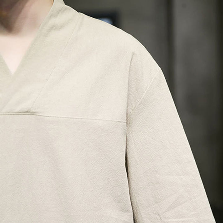 Buddha Stones夏 カジュアル シンプル Vネック デザイン メンズ コットン リネン 七分袖 Tシャツ フロントポケット付き - image 11