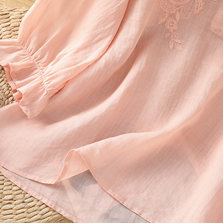 Buddha Stonesと花のつる刺繍ボタンクルーネック七分袖レディースコットンシャツ - ライトピンク - US12、 UK/AU16、 EU44 (2XL) - image 18