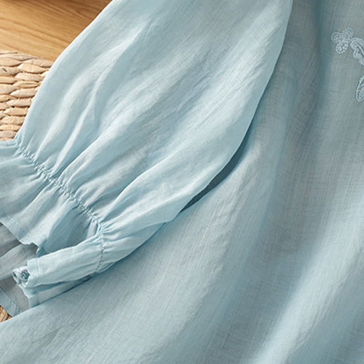 Buddha Stonesと花のつる刺繍ボタンクルーネック七分袖レディースコットンシャツ - ライトブルー - US12、 UK/AU16、 EU44 (2XL) - image 26