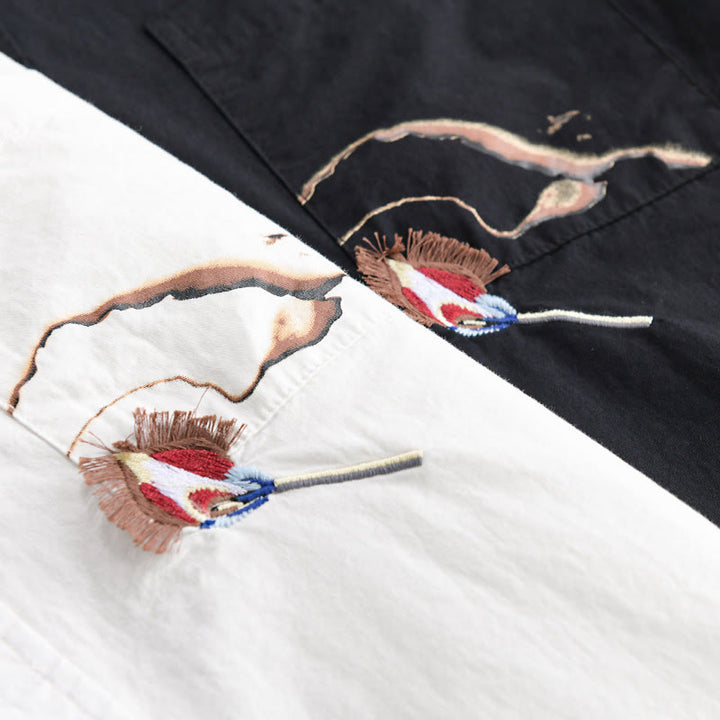 Buddha Stones刺繍マッチ炎柄ラペルメンズ半袖コットンシャツポケット付き - image 3