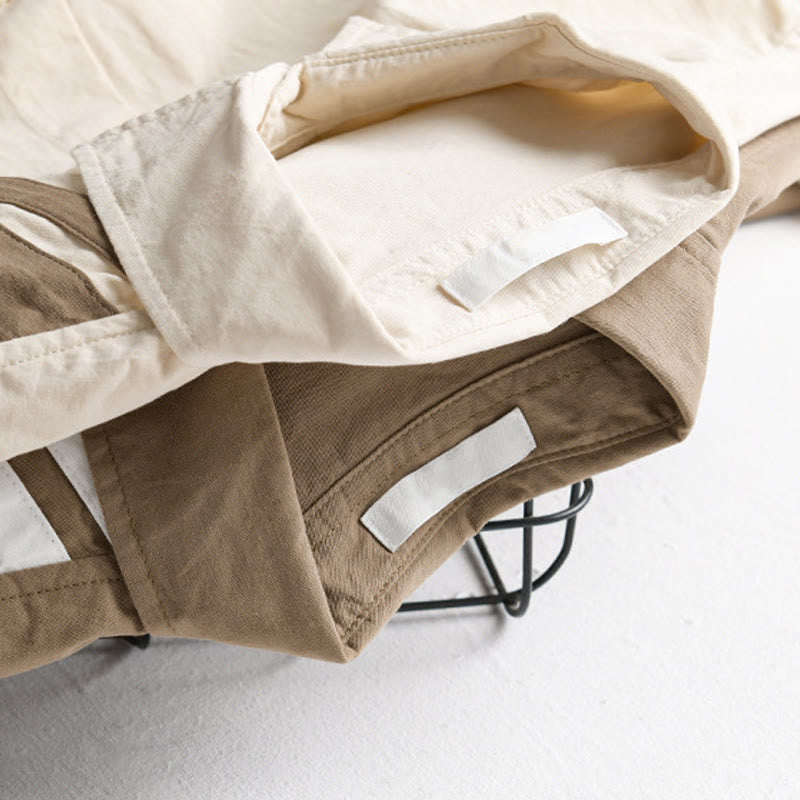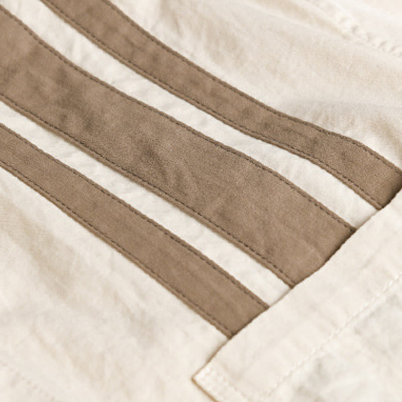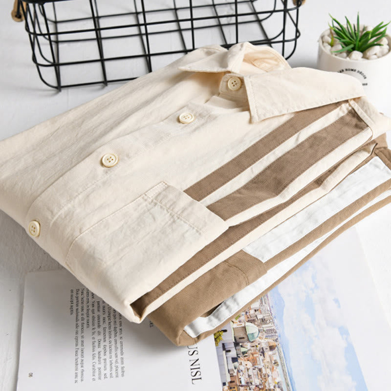 Buddha Stones秋 ラペルカラー コントラスト パッチワークデザイン メンズ 長袖 コットンシャツ ポケット付き
