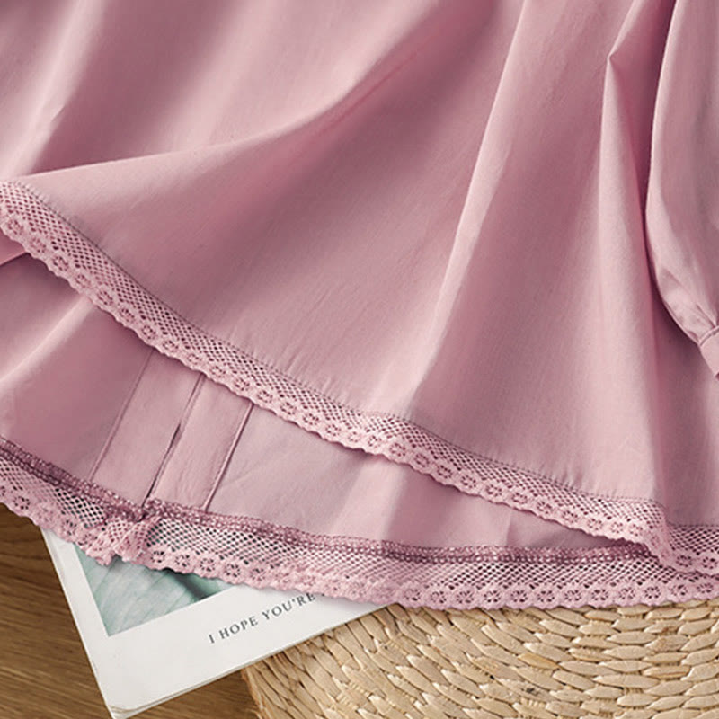 Buddha Stonesプレーン レースヘム シングルブレスト ボタン コットンリネン 七分袖 レディース クルーネック シャツ