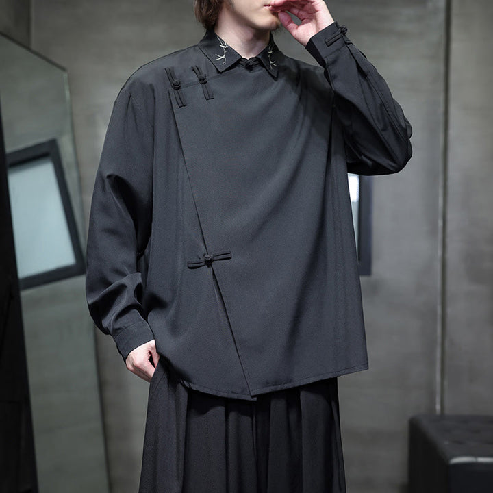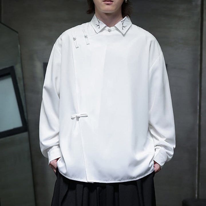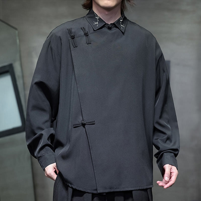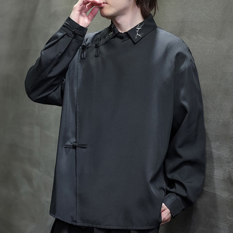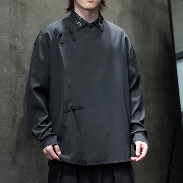 Buddha Stonesヴィンテージ純色中国風カエルボタンデザイン刺繍ラペルメンズ長袖シャツ - image 1