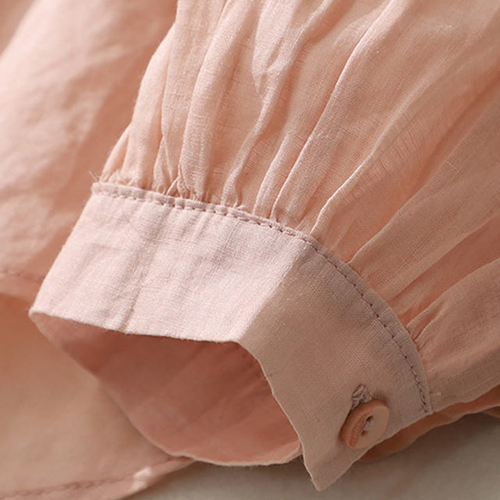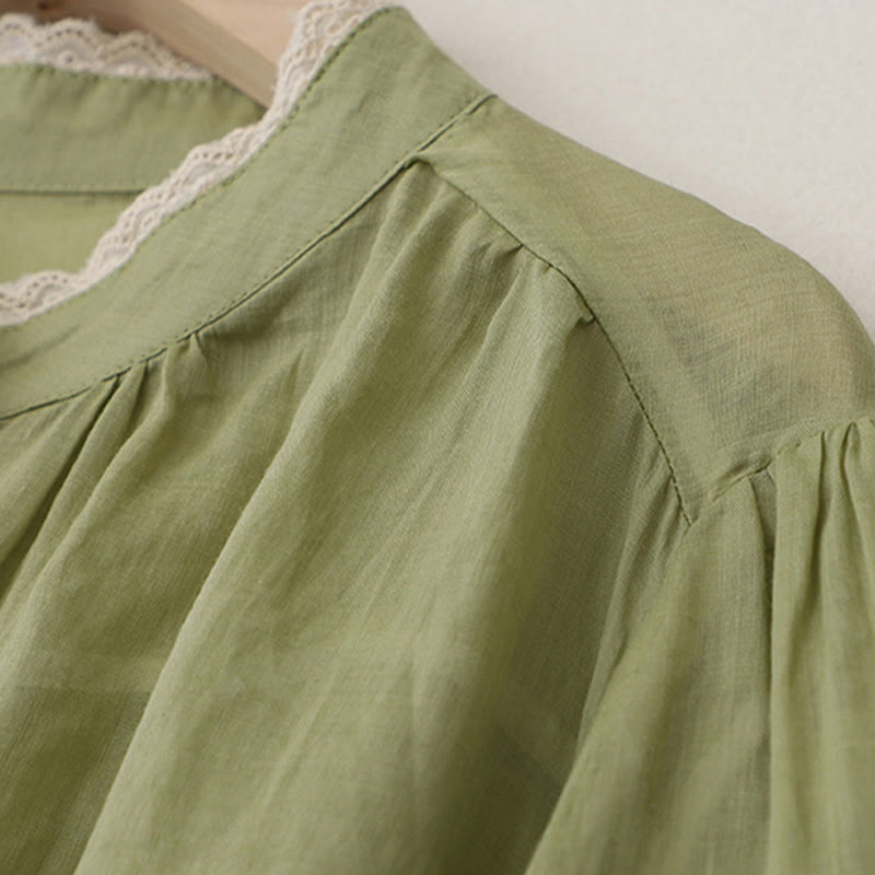 Buddha Stones純色 レースデザイン ロング ランタンスリーブ レディース コットンリネン シャツ