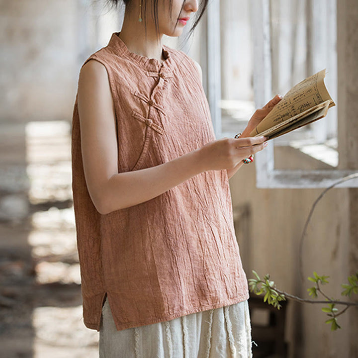Buddha Stones夏用タイダイフロッグボタンラミーコットンノースリーブレディースベスト - image 6