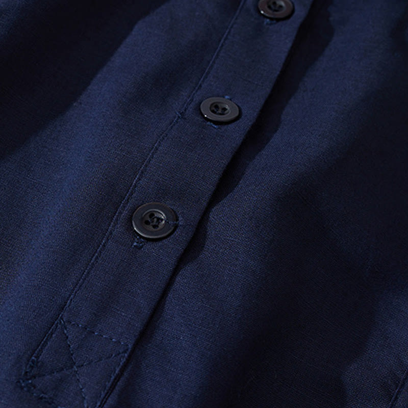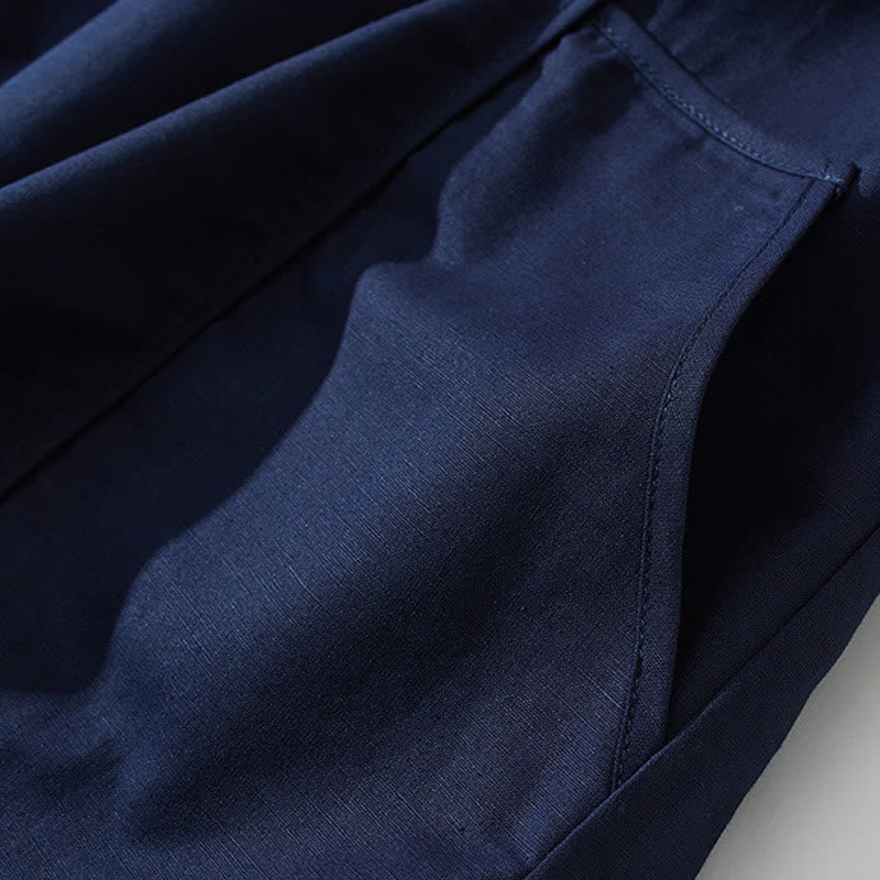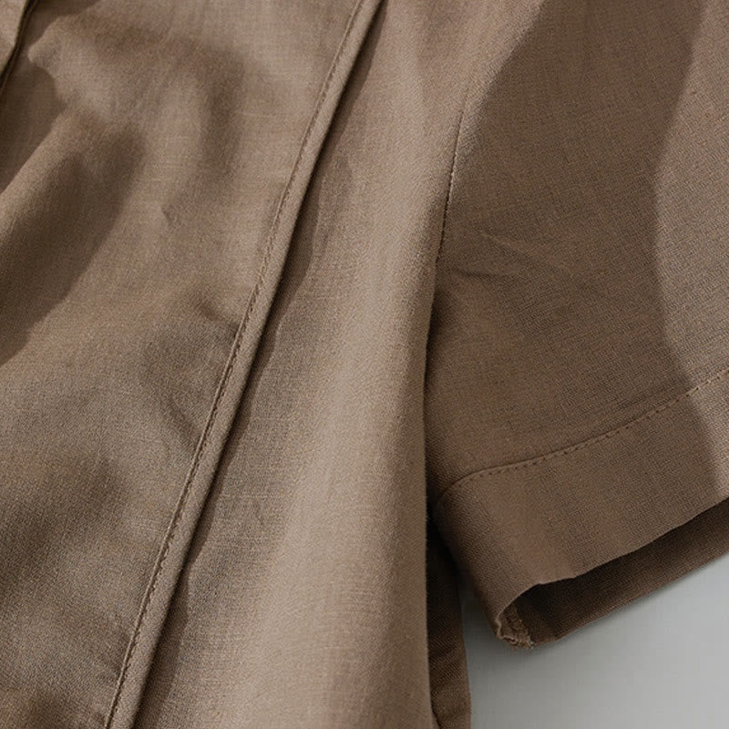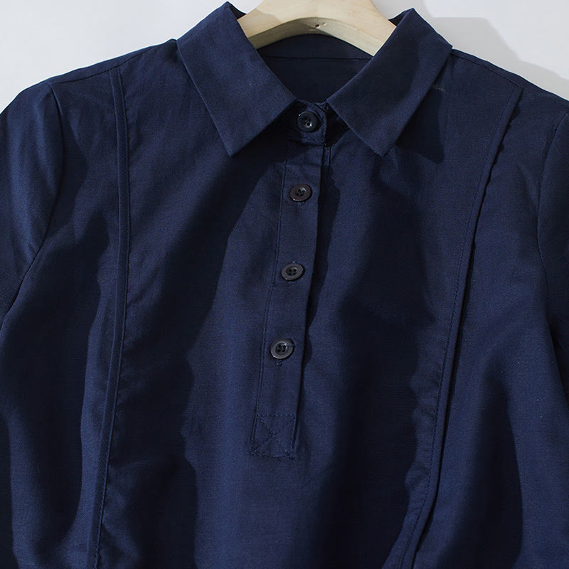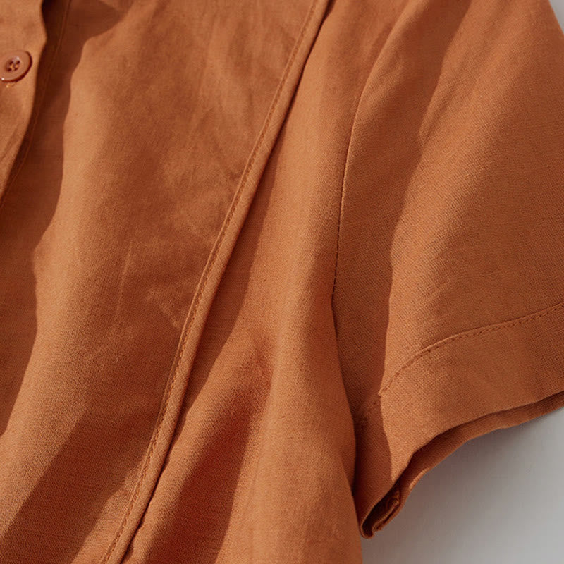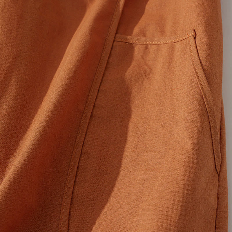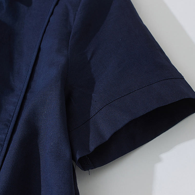 Buddha Stonesサマー レトロ 無地 ボタンデザイン 半袖 コットン ミディドレス ポケット付き