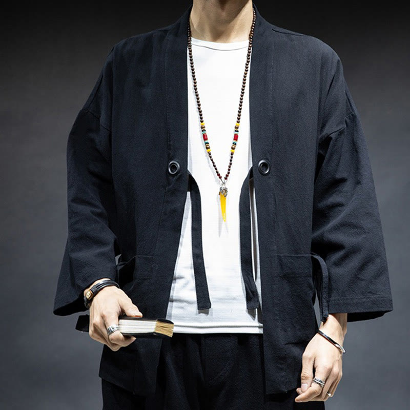 Buddha Stones無地 レースアップ オープンフロント ジャケット コットン メンズ 着物 - image 1
